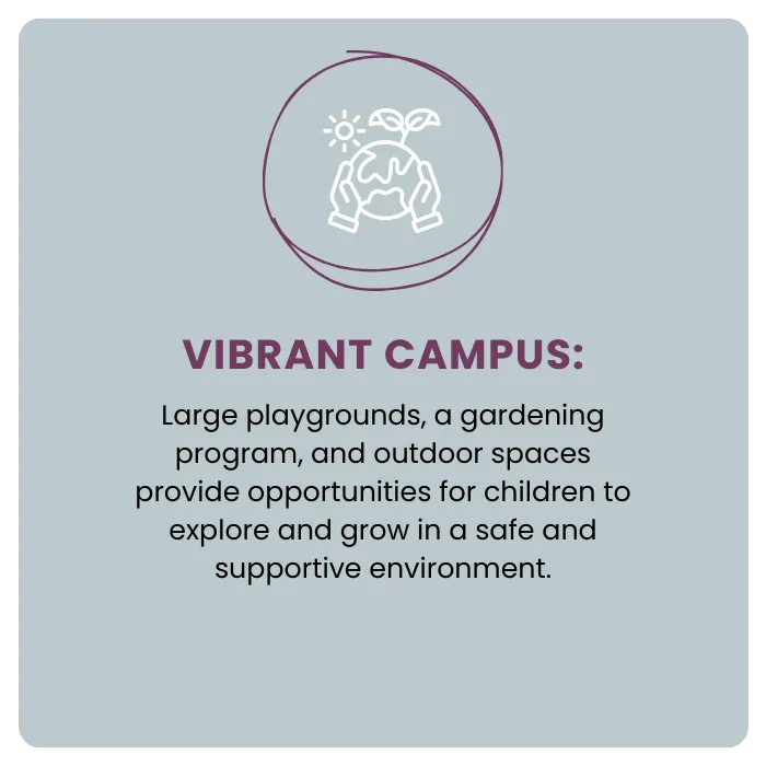 Large playgrounds, a gardening program, and outdoor spaces provide opportunities for children to explore and grow in a safe and supportive environment.