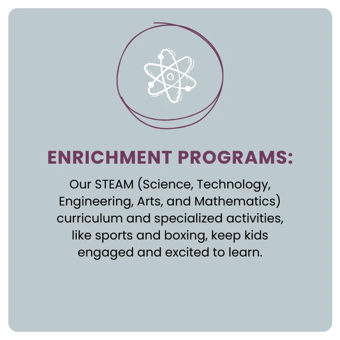 Our STEAM (Science, Technology, Engineering, Arts, and Mathematics) curriculum and specialized activities, like sports and boxing, keep kids engaged and excited to learn.