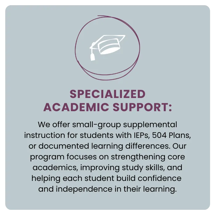We offer small-group supplemental instruction for students with IEPs, 504 Plans, or documented learning differences. Our program focuses on strengthening core academics, improving study skills, and helping each student build confidence and independence in their learning.